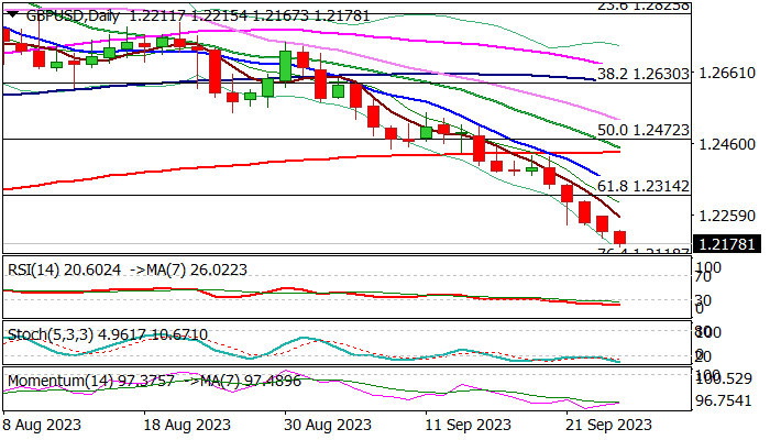 Soured risk sentiment and strong dollar on signals that the Fed may raise interest rates further and keep them high for longer period, continues to weigh on sterling.