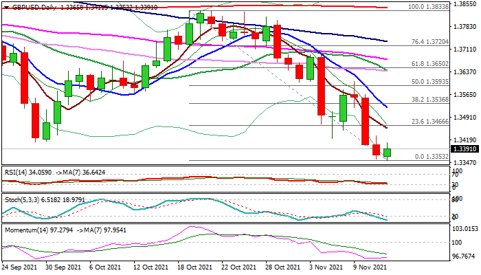 Upticks are expected to offer better levels to re-enter bearish market, as weekly studies remain in full bearish setup and the pair is on track for the third consecutive weekly fall, although bears require weekly close below former low at 1.3411 (Sep 29) to confirm negative stance and signal bearish continuation which could extend towards 1.3200 (weekly cloud base