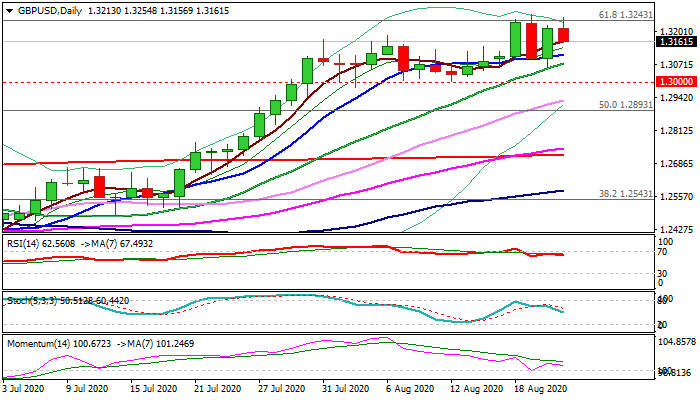 Cable probed again through pivotal Fibo barrier at 1.3243 (61.8% of 1.4376/1.1409) and approached new 2020 high (1.3266), inflated by better than expected UK retail sales data, but failed to break higher.