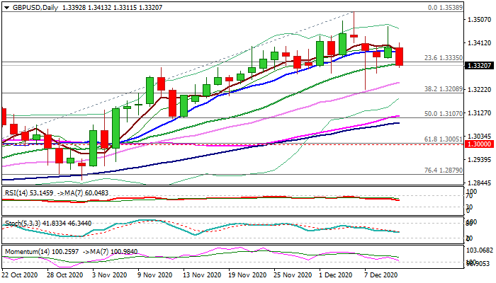 Pullback from new 2020 high at 1.3538 cracked initial supports at 1.3335/30 (Fibo 23.6% of 1.2675/1.3538 / rising 20DMA) but without clear break lower so far that keeps the downside limited.
