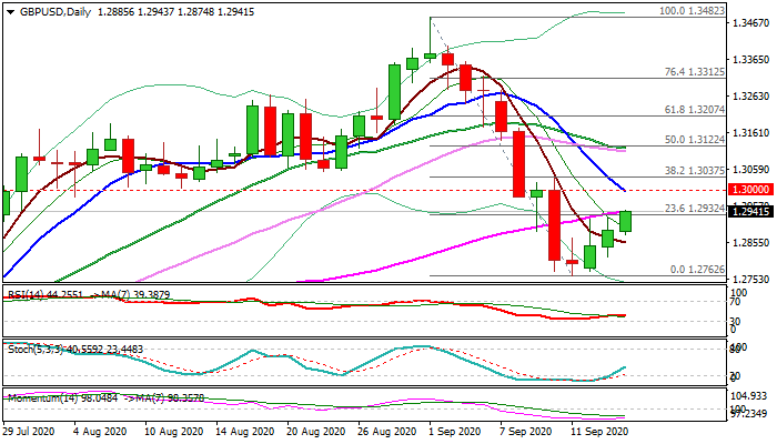 Daily techs show 14-d momentum rising from deep negative territory and RSI/Stochastic also heading north, but initial bullish signal could be expected only on firm break of daily cloud top, while rise above next pivotal barriers at 1.3000/37 (psychological / Fibo 38.2% of 1.3482/1.2762) is required to generate reversal signal.