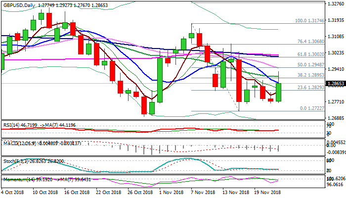 Eventual deal after Brexit talks repeatedly stalled, provides temporary relief, however, today’s rally that initially broke above pivotal barriers provided by 10SMA (1.2866); Fibo 38.2% of 1.3174/1.2722 (1.2895) and 20SMA (1.2903) needs confirmation on daily close above, which would signal further recovery.
