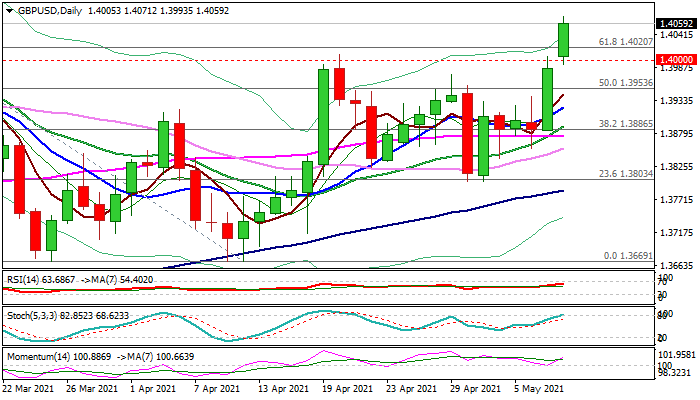 Early Monday’s advance hit 10-week high and focusing pivotal barrier at 1.4103 (Fibo 76.4% of 1.4238/1.3669 descend), after surge through 1.40 zone and break of 1.4020 (Fibo 61.8%).