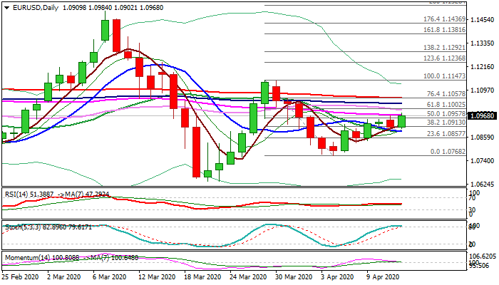 Bullish engulfing is forming on daily chart and supporting the action which is on track to generate bullish signal on close above 55DMA (1.0971) that would open key barrier at 1.10 (psychological / Fibo 61.8% of 1.1147/1.0768).