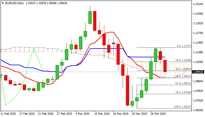 Monday’s bearish inside day was initial negative signal which materialized on today’s bearish acceleration through strong supports at 1.1008/00 (daily cloud top / psychological) and other pivot at 1.0951 (Fibo 38.2% of 1.0635/1.1147).