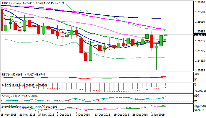 Cable holds positive tone on Monday but so far holding within narrow consolidation, following Thursday’s long-tailed Hammer and strong rally on Friday which completed reversal pattern on daily chart.