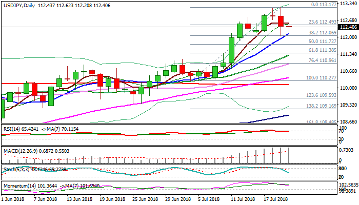 Thursday’s drop violated key near-term supports at 112.19/06 zone (16 July trough / Fibo 38.2% of 110.27/113.17) but failed to close below on first attempt.