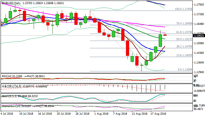 Close above 1.1575 Fibo barrier would generate bullish signal for extension towards 1.1625 (55SMA) and 1.1640 (Fibo 76.4%).