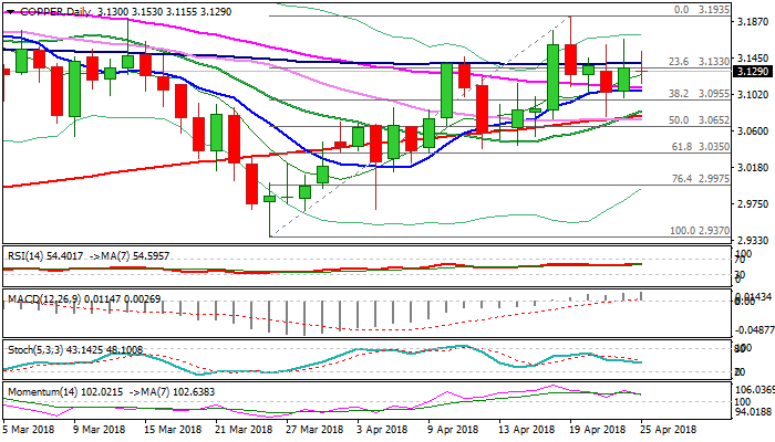 Copper price shows strong indecision on Wednesday, as repeated failures to break through falling thin daily cloud (3.1294/3.1575), shaped today’s action in long-legged Doji, signaling strong indecision, in addition to daily candles with long upper wicks of past two days.