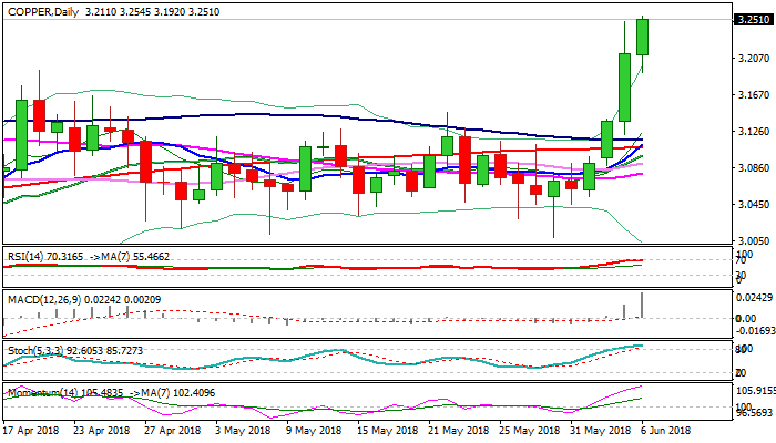 Copper holds in strong bullish mode for the fourth straight day and probes above yesterday’s new four-month high at $3.2485, following shallow corrective pullback to $3.1920 today.