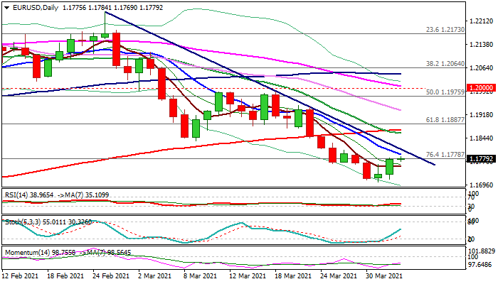 Fresh bulls face strong barriers at 1.1800 zone (falling 10DMA / bear-trendline off Feb peak at 1.2242 / base of thick 4-hr cloud / Fibo 38.2% of 1.1988/1.1704 downleg) with firm break here to add to reversal signals and open way for further recovery.