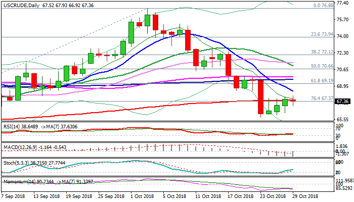 Three-day recovery rally from new nine-week low at $65.73 (23 Oct) shows initial of stall on approach to daily cloud base ($68.11) and lacks momentum to sustain break above 200SMA ($67.49), following Friday’s marginal close above it, after two repeated failures on Wed/Thu.