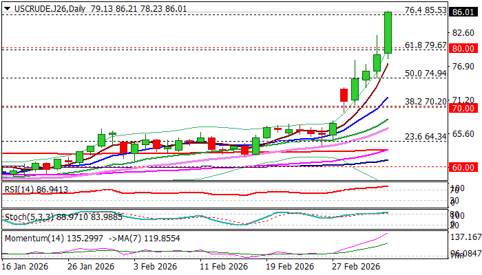 Friday’s strong acceleration surged through round-figure $80 barrier and broke technical resistance at $85.53 (Fibo 76.4% of $95.00/$54.87, 2023/2025 downtrend), violation of which to open way towards Apr 2024 double-top ($87.61) and unmask $90 barrier.