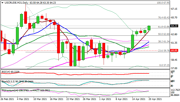 Fresh advance broke above important Fibo barrier at $63.86 (61.8% of $67.95/$57.25) with daily close above here to confirm bullish signal and open way for gains towards targets at $65.42/$66.38 (Fibo 76.4% / Mar 15 high).