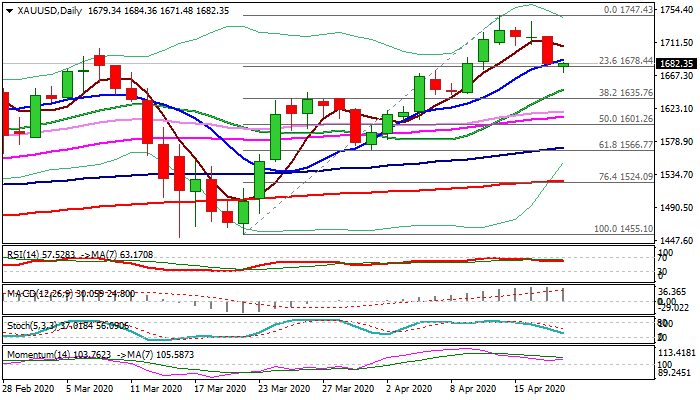 Corrective action should be ideally contained at $1678 zone, however deeper dips towards next key supports at $1647 (20DMA); $1641 (8 Apr higher low) and $1635 (Fibo 38.2% of $1455/$1747) cannot be ruled out before bulls regain traction.