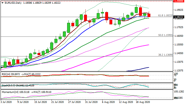 Dips should find ground above key supports at 1.1739/11 (monthly cloud base / 12 Aug trough) to keep immediate bulls in play, but deeper pullback towards 1.1660 (Fibo 38.2% of 1.1168/1.1965) cannot be ruled out on stronger bearish acceleration.
