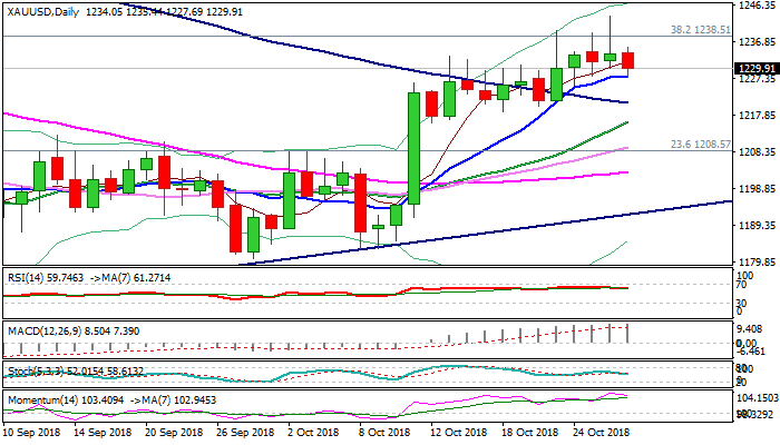 Spot gold trades in red on Monday as bulls start to lose traction after triple failure to firmly break above cracked Fibo barrier at $1238 (38.2% of $1365/$1160 fall).
