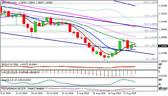 Cable holds in tight range and directionless mode in early Monday’s trading, as falling 20SMA (currently at 1.2868) continues to cap, but pullback from recovery high at 1.2936 (22 Aug) has so far been contained by north-turning 10SMA (1.2798).