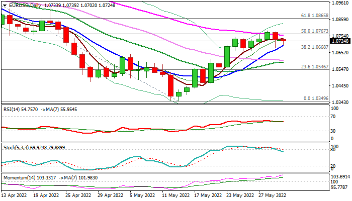 The Euro is trading within a tight range on Wednesday, as recovery rally from 1.0349 low failed to clear pivotal barriers at 1.0767 (55DMA / 50% retracement of 1.1184/1.0349), but subsequent pullback was strongly rejected and contained by rising 10DMA, keeping the downside protected for now.