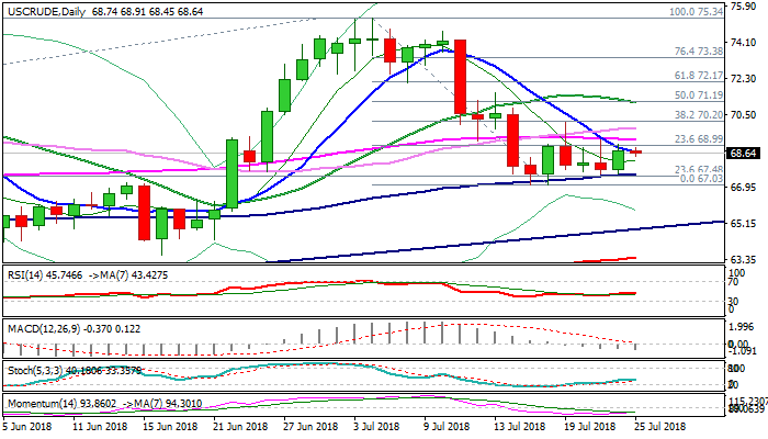 Daily chart shows oil price entrenched within narrowing range between 100SMA ($67.58) and 55SMA ($69.26) which extends into seventh straight day and maintaining directionless mode.