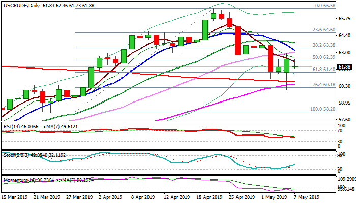 WTI oil holds in narrow range directionless mode on Tuesday, following Monday’s strong rejection at converged 200/55SMA’s ($60.64/49) and repeated failures to close below cracked Fibo pivot at $61.40 (61.8% of $58.20/$66.58 upleg).