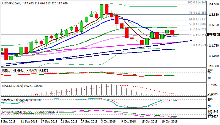 Break of either side would provide initial direction signal, with break higher to open barriers at 113.08 (daily Kijun-sen / Fibo 50% of 114.54/111.62) and 113.43 (Fibo 61.8%).