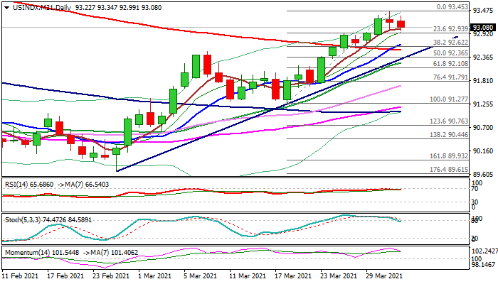 Loss of initial support at 92.93 (Fibo 23.6% of 91.27/93.45 upleg) would increase risk of an extension towards key supports at 93.62/42 zone (Fibo 38.2% / 200DMA / bull-trendline connecting 89.66 and 91.27 lows).