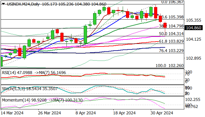 On the other hand, subsequent bounce from new low (104.38) warns of increased headwinds that bears face from next key support at 104.31 (Fibo 50% / 55DMA) which may keep the price in short consolidation, before resuming lower.