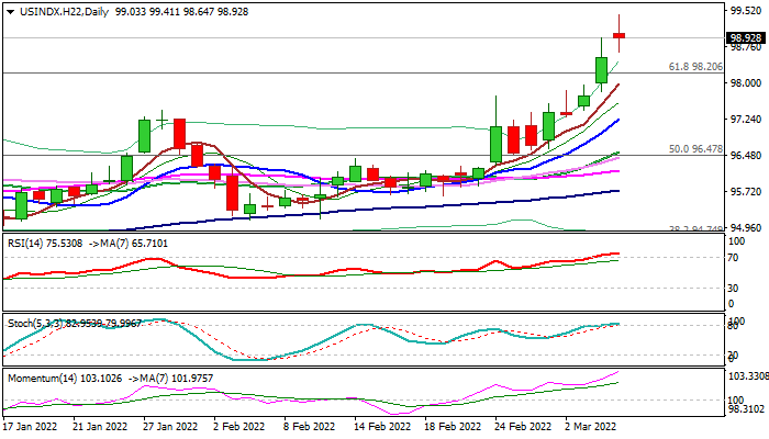 This additionally supports the greenback, which maintains strong bullish momentum and targets pivotal barriers at 100.00 and 100.34 (psychological / Fibo 76.4% of 103.80/89.15 fall), violation of which would generate fresh bullish signal for further advance, if market conditions remain dollar-favorable.