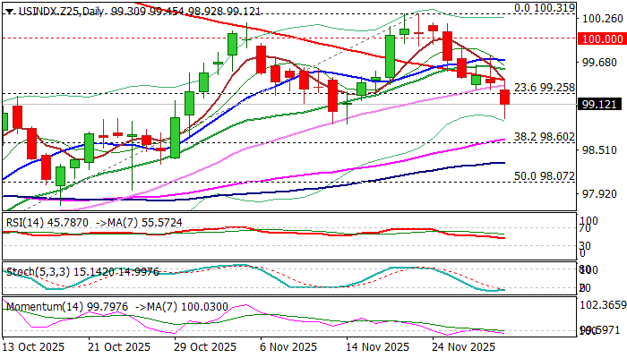 Bull-trap at $100 level and initial signal of formation of reversal pattern on monthly chart contribute to negative scenario, although firm break of $98.85/60 zone (Nov 14 low / 55DMA / Fibo 38.2% of $95.82/$100.31) is still required to signal reversal on daily chart and open way for further retracement of $95.85/$100.31 rally.