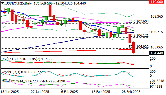 The dollar index extends steep fall into third straight day, under strong pressure from tariff concerns, dovish shift in US policymakers narrative on interest rates and signals about German stimulus.