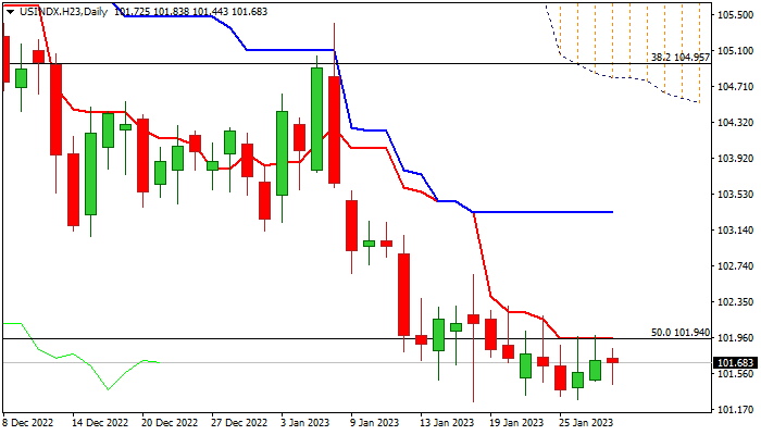 Technical picture remains firmly bearish on daily chart, with initial resistance provided by daily Tenkan-sen (101.94) which recently capped several attacks, followed by daily Kijun-sen (103.32), which should cap extended upticks and keep bears intact.