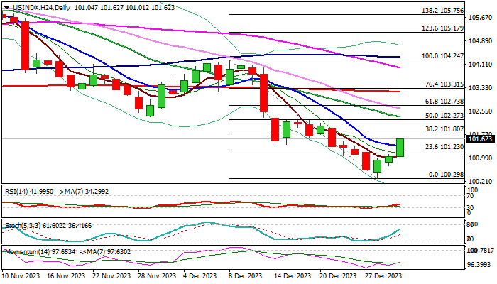 The dollar index accelerated higher on the first trading day in 2024, extending bounce from five-month low of Dec 28 (100.30) into third consecutive day.