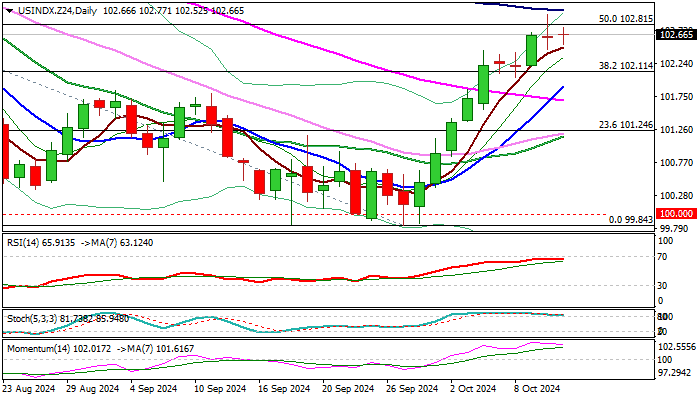 Rising 5DMA / Thursday’s low mark immediate supports at 102.45, guarding more significant 102.00 zone (broken Fibo 38.2% of 105.78/99.84 / round-figure / rising 10DMA), loss of which would open way for deeper correction of 99.84/102.95 upleg and expose next pivotal supports at 101.76/68 (Fibo 38.2% / daily cloud base / rising daily Tenkan-sen) and 101.40 breakpoint (50% retracement / daily Kijun-sen).