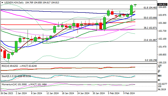 Fresh advance generated bullish signals on break above near-term consolidation range and close above pivotal Fibo barrier at 104.46 (61.8% retracement of 107.03/100.29 downtrend).