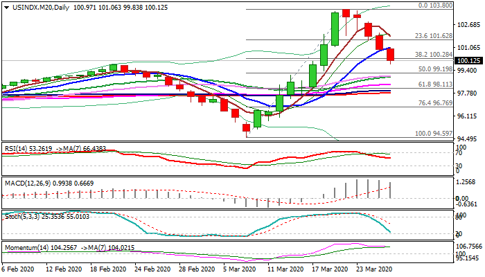 Fresh weakness broke below key supports at 100.28/00 (Fibo 38.2% of 94.59/103.80 rally / psychological), generating strong reversal signal.