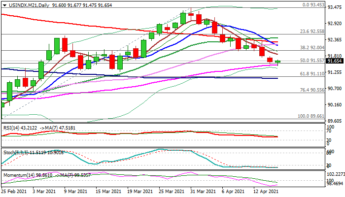 Bears cracked significant supports at 91.55/51 (50% retracement of 89.66/93.45 upleg / 55DMA) but failed to make a clear break at the first attempt, facing headwinds from nearby rising daily cloud (cloud top lays at 91.32) and signaling a brief pause before resuming the downtrend from 93.45 (Mar 31 high).