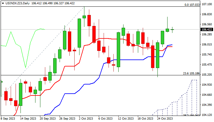 Larger bulls remain intact and keep in play expectations for continuation of larger uptrend after consolidative phase ends, with violation of pivotal 107 resistance zone (50% retracement of 114.72/99.20 downtrend of Sep 22 / July 23 / new 2023 high) to expose targets at 107.88 (22 Nov 2022 high) and 108.79 (Fibo 61.8% of 114.72/99.20).