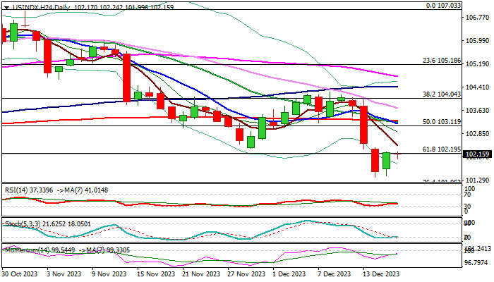 The dollar index is struggling to extend recovery from last week’s 1.7% drop, with the action being repeatedly capped by broken Fibo support at 102.19 (61.8% of 99.20/107.03) which reverted to solid resistance.