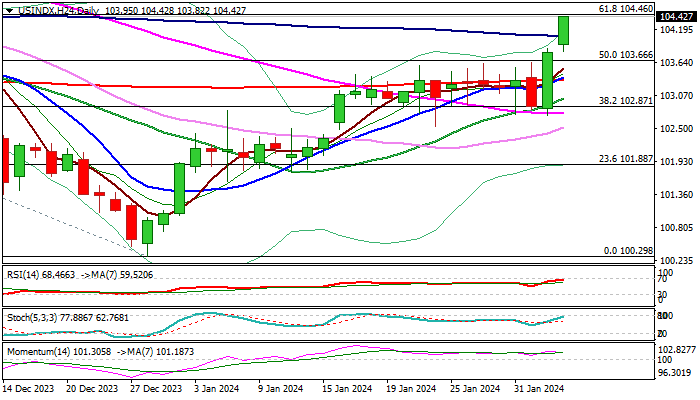 The latest rally also generated a number of bullish signals (Friday’s bullish engulfing pattern, close above 200DMA at 103.37, formation of 10/200DMA golden cross, close above the top of thick daily cloud at 103.63 and break above 100DMA at 104.08) which strongly contribute to bullish near-term outlook.