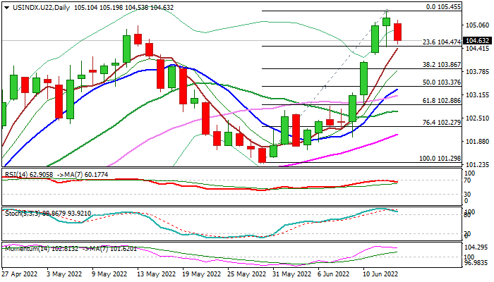 The index is holding just under new 2022 high (105.45) also the highest in two decades and could extend towards Fibo projections at 106.50/107, with possible stronger bullish acceleration to threaten 108/110 zone.