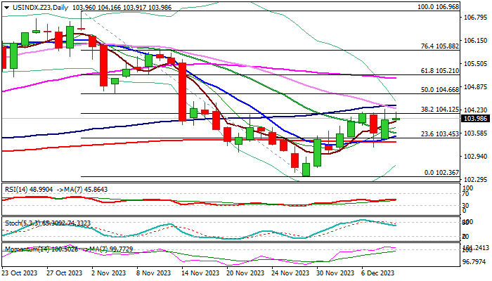 However, recovery faces headwinds from pivotal barrier at 104.10 zone (Fibo 38.2% of 106.96/102.36 / falling daily Kijun-sen / top of recent range) with firm break here needed to signal bullish continuation and expose targets at 104.66/94 (50% retracement / daily cloud base).