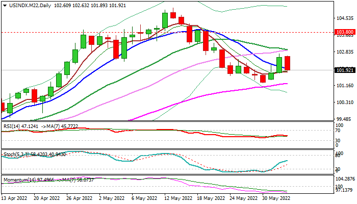 Fresh weakness has retraced the most of Thursday’s 0.75% daily advance and also 50% of entire 101.29/102.73 recovery rally, cracking pivotal 10DMA support (102.00), close below which would weaken near-term structure, as 14-d momentum remains deeply in the negative territory and MA’s (10/20/30) will turn to bearish configuration.