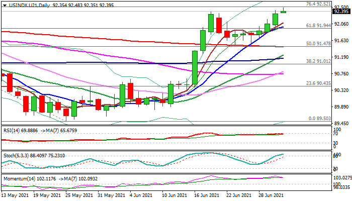 Bulls pressure pivotal Fibo barrier at 92.52 (76.4% of 93.45/89.50 fall) and 92.58 (base of thick weekly cloud) break of which would open way towards 2021 high at 93.45 (Mar 31).