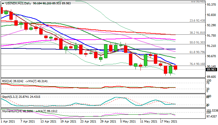 Daily techs are in full bearish setup and warn of further dollar’s weakness, however oversold weekly stochastic signals extended consolidation before larger bears resume towards key support at 89.15 (2021 low).