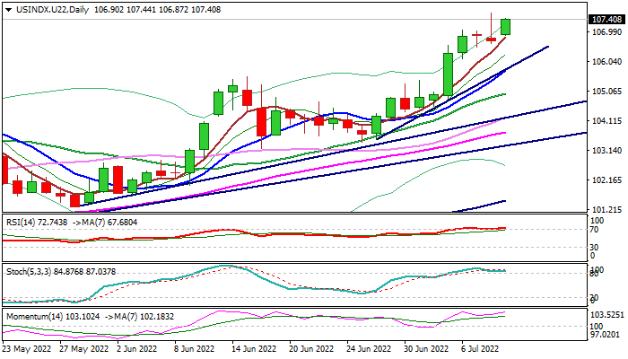 Bulls return to play on Monday after a brief consolidation on Thu/Fri and eye new 20-year high at 107.60, as dollar remains well supported by global growth concerns, weak Euro and strong signals that the Fed will remain on strong hawkish path.
