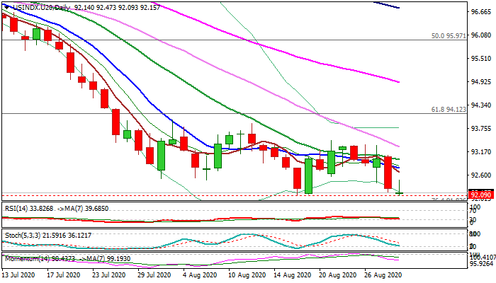 The dollar hit session low (92.09) in early US trading on Monday, after brief recovery attempt stalled at 92.47.