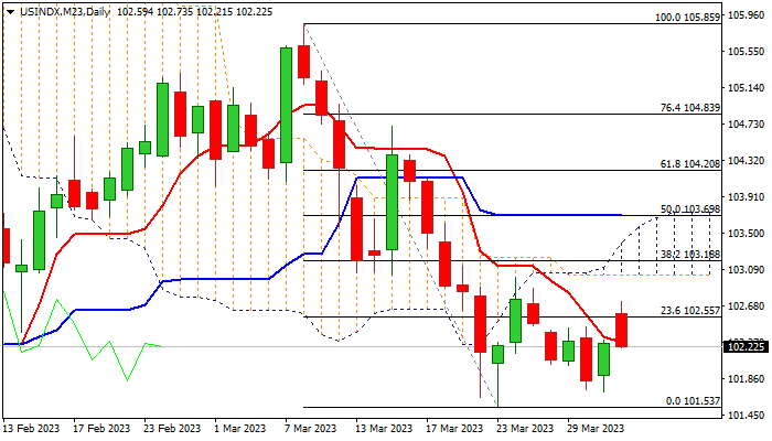 Initial signs of recovery stall on attempts through Fibo barrier at 102.55 (23.6% of 105.85/101.53 fall), reflect still negative technical studies on daily chart, as 14-d momentum remains in bearish mode and thickening daily cloud above the price continues to weigh.
