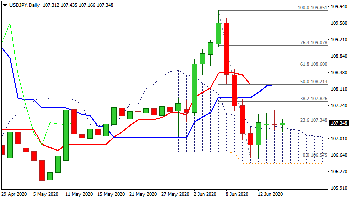 Recovery needs break above 107.61 (converged 30/55DMA’s) and more important 107.82/84 barriers (Fibo 38.2% of 109.85/106.57 / converged 10/20DMA’s) break of which would generate fresh bullish signal.