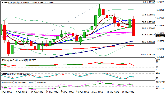 Fresh weakness has fully reversed recovery of past two days and cracked pivotal supports at 1.2667/61 (Mar 19 spike low / Fibo 61.8% of 1.2518/1.2893/ top of thin daily cloud), on track for the biggest daily loss since Oct 12 and completion of bearish engulfing pattern on daily chart, which will add to negative near-term outlook.